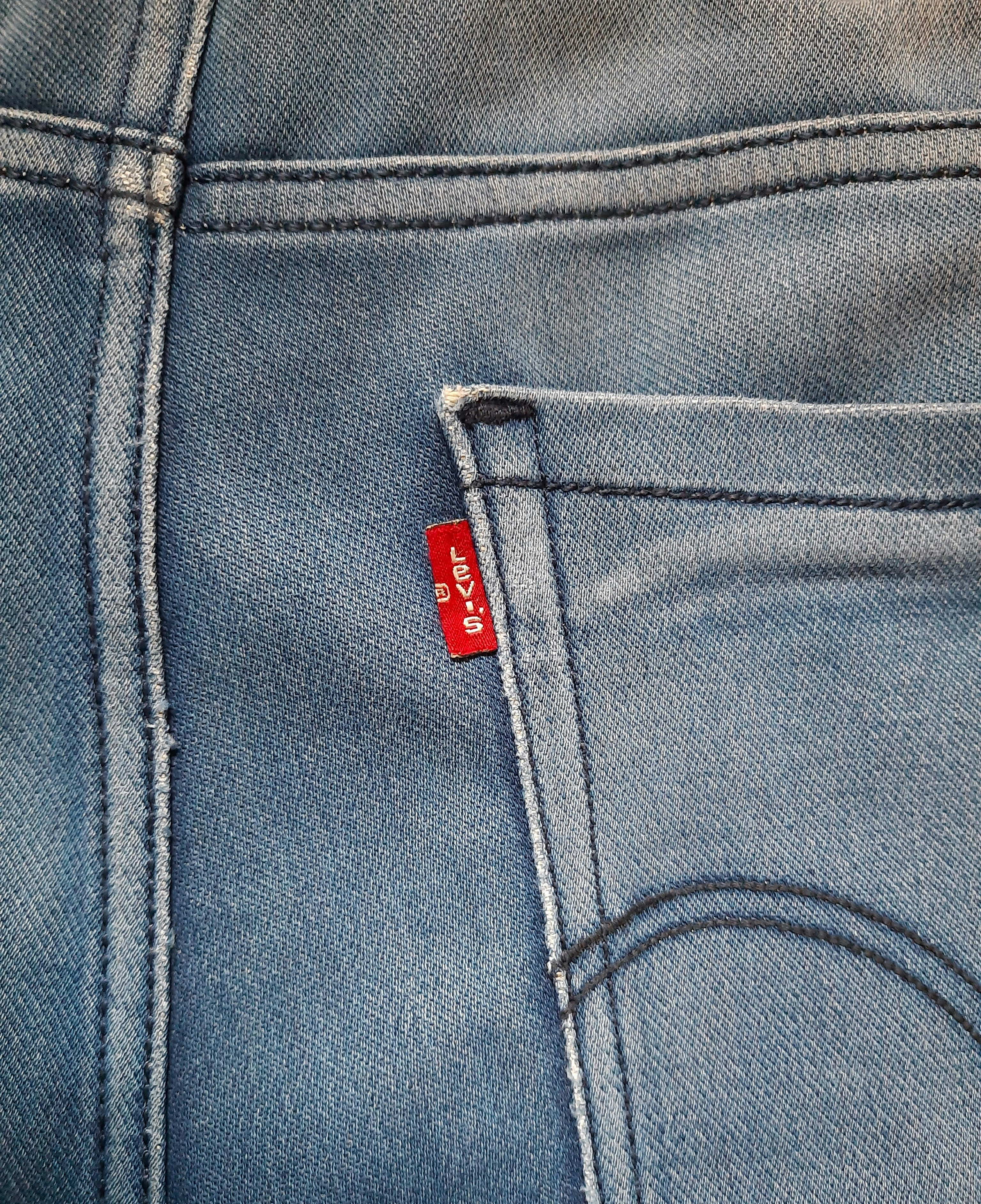 Learn The 7 Key Details From Levi's Jeans Back Pocket The word LEVI'S is stitched in white in all capital letters on one side only of the tab in the beginning. During the early '50's they changed the Red Tab into a double-sided Red Tab which means that on both sides of the tab LEVI'S was written. Vintage 'Big E' tab on a vintage pair of Levi's 501XX from the '60's.