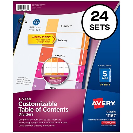 Avery Templates in Microsoft Word | Avery.com Download Free Templates Easily search for your template by product category and then choose from one of our a professional designs or blank templates to customize within Word. Find a Template Printing Tips for Microsoft Word Here's how to be sure your product, page settings and printer settings can help you get the best print results. Learn how Big Tab 5 and 8 Tabs Dividers Template | Avery.com Big Tab 5 and 8 Tabs Dividers Template | Avery.com Big Tab 5 and 8 Tabs Dividers Template You can go to avery.com/templates to find the template for your divider. These template numbers can be used for Big Tab 5 Tab Divider Templates: -11900 -11109 -11113 -11121 -11122 -11273 -11160 -11221 -11902 -11906 -11185 -11956 -11110 -11982 -81310 Avery Ready Index® Table of Contents 8-Tab - 11519 - Template Avery Design & Print. Add logos, images, graphics and more. Thousands of free customizable templates. Mail Merge to quickly import entire contact address list. Free unlimited usage, no download required. START DESIGNING UPLOAD YOUR OWN ARTWORK. Skip to the end of the images gallery. Skip to the beginning of the images gallery.