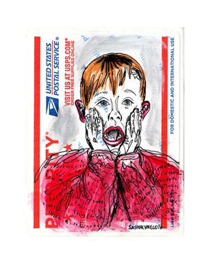 Original sticker slap, street urban art USPS Priority mail label 228, illustration drawing by Larry Calabrese Art