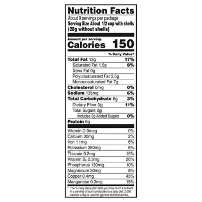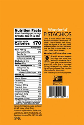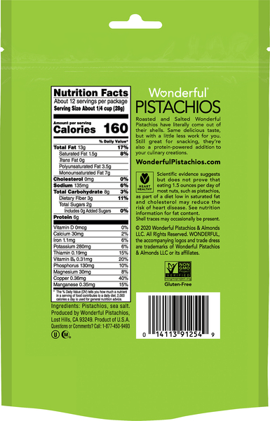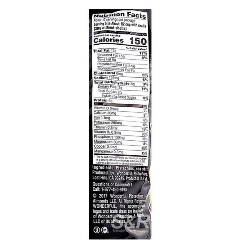 Calories in Wonderful Pistachios and Nutrition Facts - FatSecret May 3, 2022 · Pistachios Nutrition Facts Serving Size 1/2 cup with shells (28 g) Amount Per Serving Calories 160 % Daily Values* Total Fat 13.00g 17% Saturated Fat 1.500g 8% Trans Fat 0.000g Polyunsaturated Fat 3.500g Monounsaturated Fat 7.000g Cholesterol 0mg 0% Sodium 135mg 6% Total Carbohydrate 8.00g 3% Dietary Fiber 3.0g 11% Sugars 2.00g Pistachio Nutrition Facts and Health Benefits - Verywell Fit The following nutrition information is provided by the USDA for one ounce of unsalted pistachios without shells (28g, or roughly 1/4 cup).1