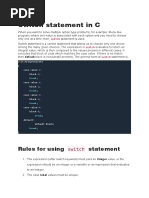 Data type of case labels of switch statement in C++? In C++ switch statement, the expression of each case label must be an integer constant expression. For example, the following program fails in compilation. CPP /* Using non-const in case label */ ... Using range in switch case in C/C++. 5. Nested switch case. 6. Difference between Type Casting and Type Conversion. 7. Local Labels in C. 8. Lỗi: Chuyển đến nhãn trường hợp - QA Stack Vấn đề là các biến được khai báo trong một casevẫn được hiển thị trong các cases tiếp theo trừ khi sử dụng một { }khối rõ ràng , nhưng chúng sẽ không được khởi tạo vì mã khởi tạo thuộc về một mã khác case.. Trong đoạn mã sau, nếu foobằng 1, mọi thứ đều ổn, nhưng nếu bằng 2, chúng ta sẽ vô tình sử ... How to fix error: jump to case label in switch statement? The "Jump to case label" error in a C++ switch statement occurs when a jump statement, such as "break", "goto", or "return", is omitted and the execution flow jumps to the next case label by accident. This can cause unexpected behavior and make the code harder to maintain. Jump statements in C++ - GeeksforGeeks In C++ there is four jump statement: continue, break, return, and goto . Continue: It is used to execute other parts of the loop while skipping some parts declared inside the condition, rather than terminating the loop, it continues to execute the next iteration of the same loop.